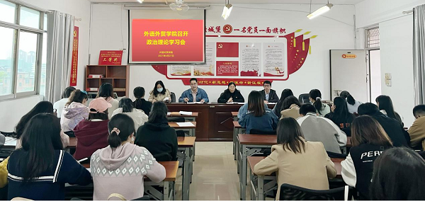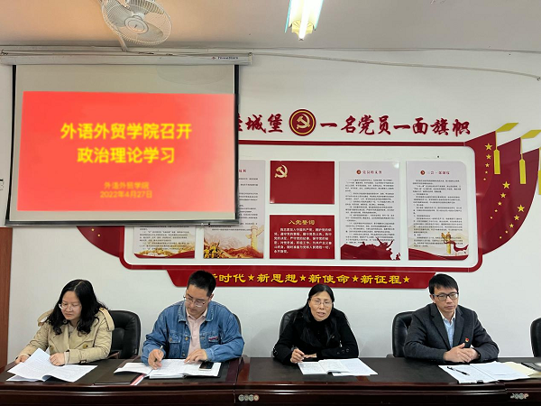 为深入学习贯彻习近平新时代中国特色社会主义思想、党的十九大和十九届历次全会精神,认真贯彻落实习近平总书记关于教育的重要论述,深刻认识“两个确立”的决定性意义,增强“四个意识”、坚定“四个自信”、做到“两个维护”,4月26日,外语外贸学院召开政治理论学习会,学院党总支书记、院长车婧主持会议,全体党员教师参加。