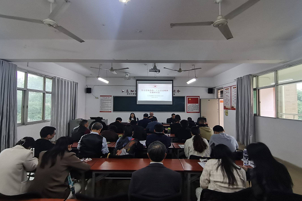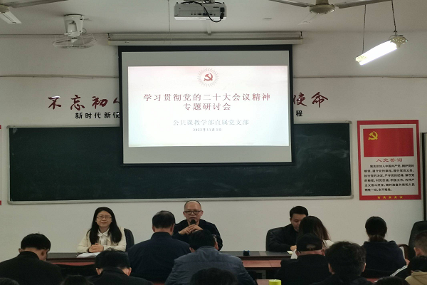 11月3日下午16点,公共课教学部直属党支部在C栋201活动室召开学习贯彻党的二十大会议精神专题研讨会。会议有直属党支部副书记黄琴主持,支部书记、教学部主任聂水晶出席会议,副主任沈龙辉参加会议,部分党员、教师参会。聂水晶做了重要讲话。结合自身工作情况学习贯彻党的二十大会议精神,教师代表张晓春、符小根、李军桦发言。