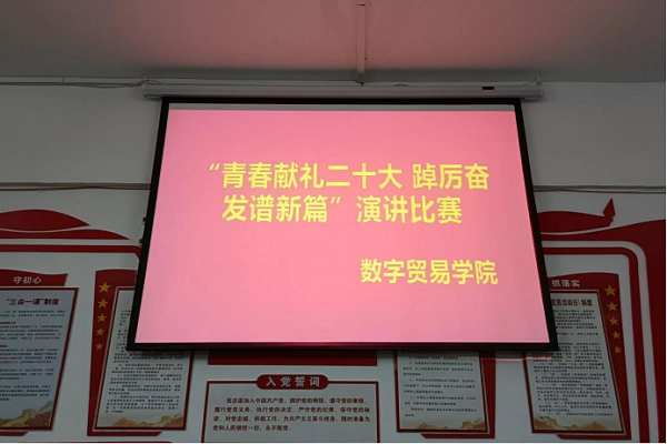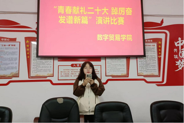 为进一步深入学习贯彻党的二十大精神,引导学生坚定理想信念,不忘初心跟党走的爱国情怀,2022年11月13日晚上,数字贸易学院于B201开展“青春献礼二十大 踔厉奋发谱新篇”主题演讲比赛。