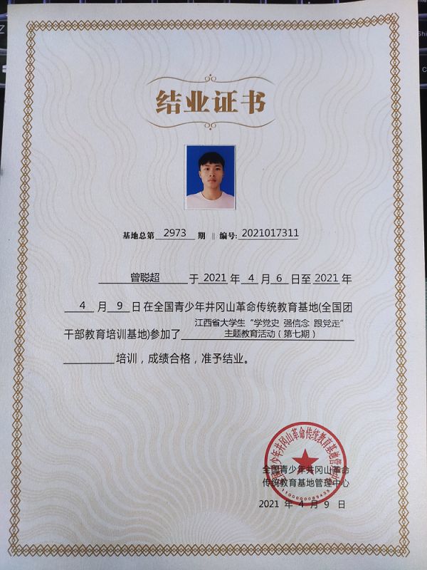 2021年 全国青少年井冈山革命传统教育结业证书