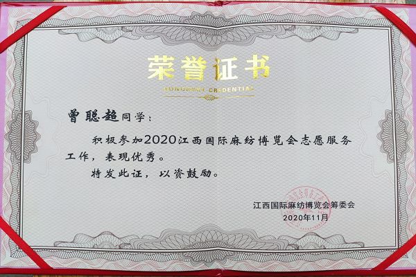 2020年 江西省国际麻纺博览会“优秀志愿者”