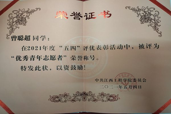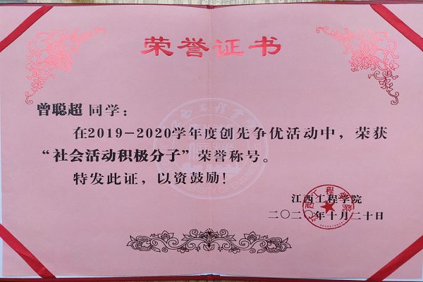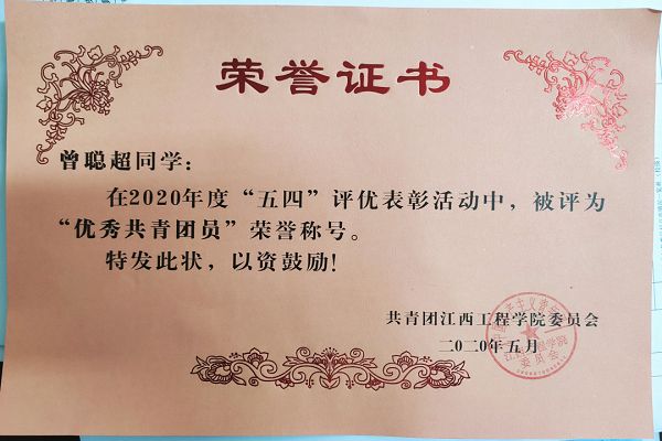 在2020年,曾聪超同学接过了校青年志愿者协会副会长的重担。对于组织工作及团组织布置的每一项工作都勤勤恳恳,团结协会成员一起认真地完成各项工作任务。认真工作的态度和敬业精神获得大家一致好评。学习中,他始终奉行一句话:“刻苦学习,扎实掌握为人民服务的真本领”。作为一名学生干部,他合理安排时间,平衡好工作和学习的关系,刻苦学习科学文化知识,为自己具有较强的文化科学和业务素质打下坚实的基础。