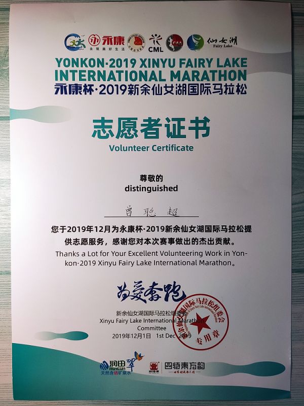 2019年 新余仙女湖国际马拉松“优秀志愿者”