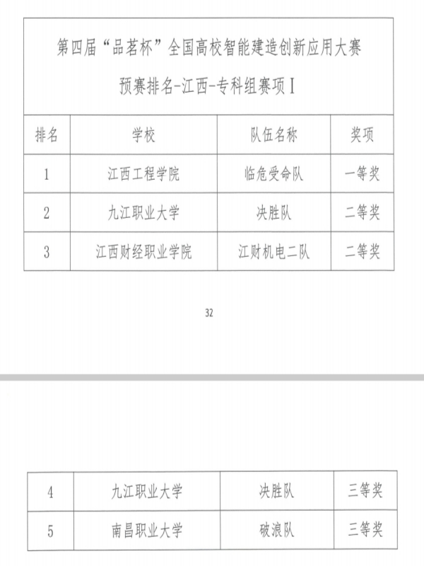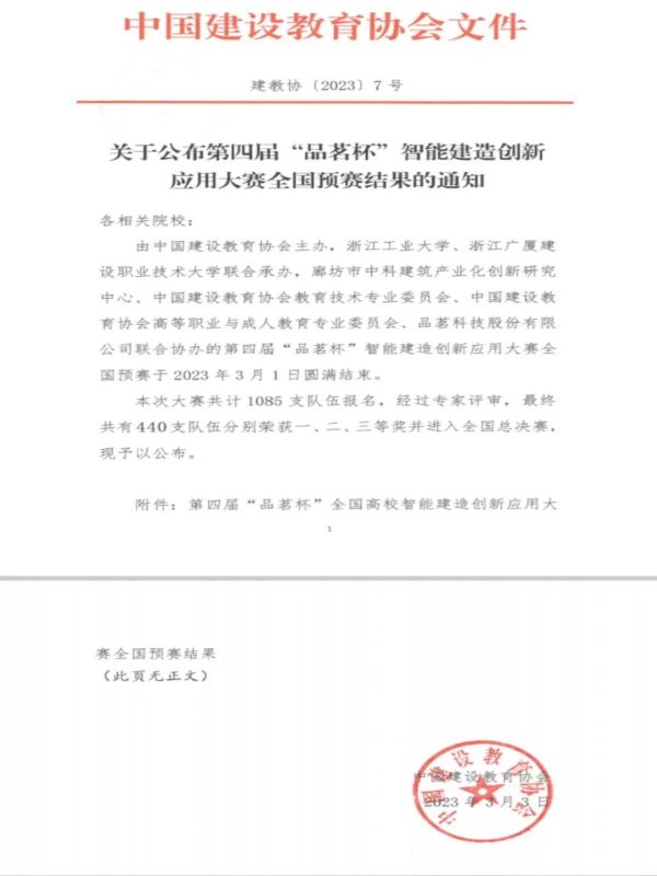 2023年2月19日,由中国建设教育协会主办的第四届“品茗杯”全国高校智能建造创新应用大赛落下帷幕。3月1日成绩公布,我校土木工程学院参赛学生毛南南、杨帅华、马乙申、邓锦,在指导教师伍伟娟、陈水根的指导帮助下,组成临危受命队伍参赛,与来自全国不同地区的队伍同场竞技,经过激烈角逐,荣获江西地区一等奖,并取得国赛参赛资格。