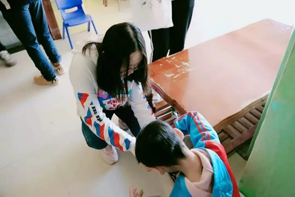 青年志愿者们给小朋友们分发水果和零食,并且和他们一起互动交流,愉快玩耍,其乐融融。