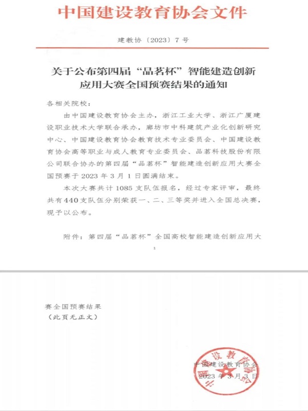 2023年2月19日,由中国建设教育协会主办的第四届“品茗杯”全国高校智能建造创新应用大赛落下帷幕。3月1日成绩公布,华亿在线土木工程学院参赛学生毛南南、杨帅华、马乙申、邓锦,在指导教师伍伟娟、陈水根的指导帮助下,组成临危受命队伍参赛,与来自全国不同地区的队伍同场竞技,经过激烈角逐,荣获江西地区一等奖,并取得国赛参赛资格。