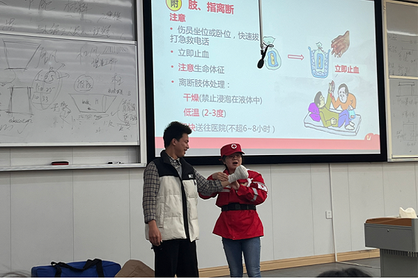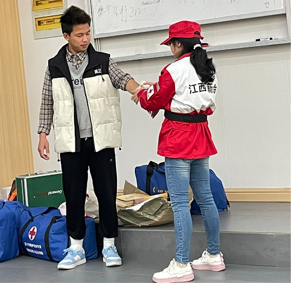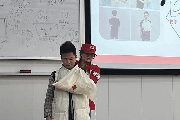 培训课上,易金玲老师向同学们介绍了红十字运动的基础知识。通过理论学习,大家进一步了解到了红十字的意义和精神内核。随后,易老师教授了同学们环形、螺旋、螺旋反折各式受伤包扎方法,详细讲解了骨折固定、断肢包扎以及常见急症、突发事件等急救理论与施救技巧。现场学员积极互动,气氛活跃。