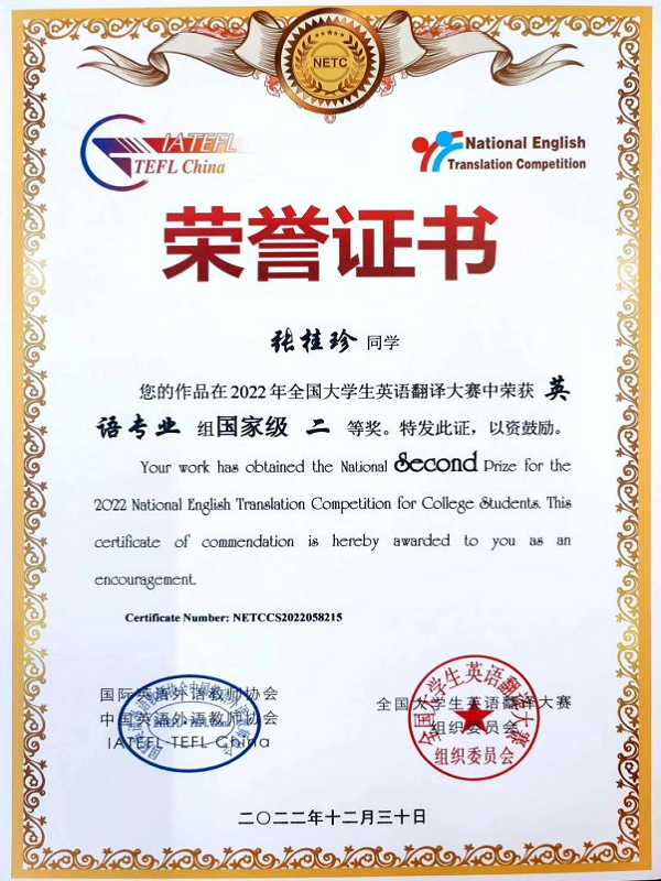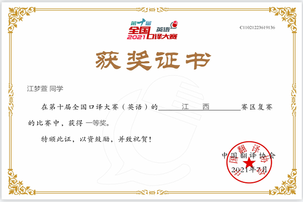 学院在进行专业人才培养时,既注重夯实学生的专业基础,同时创造条件让学生参加与专业密切相关的各类竞赛与活动,以提高他们运用语言的综合能力,从而提高人才培养的质量。学生参加全国大学生英语竞赛、全国商务英语技能大赛、全国口译大赛等各类竞赛,近三年共获得国家级奖项3个,省级一等奖8个、二等奖20个、三等奖30个、团体奖2个。