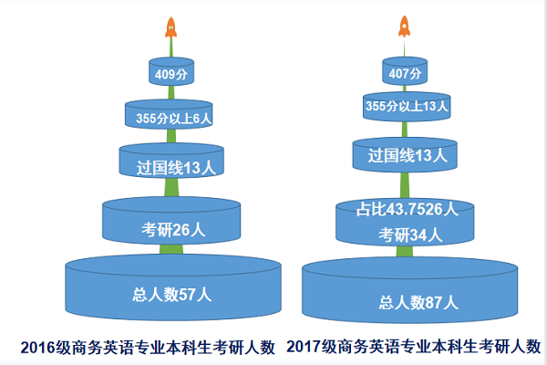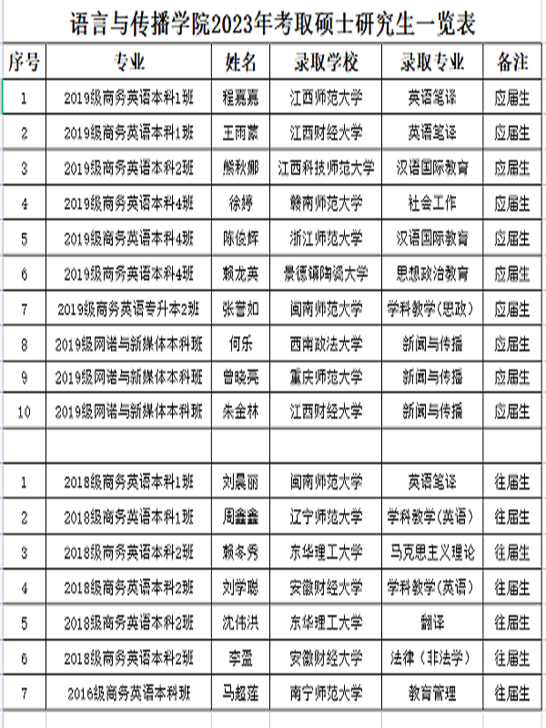 语言与传播学院目前共有38名学生考取硕士研究生。2020年首届商务英语本科专业共有4名同学被录取,2021年共有13人被录取到南昌大学、福建师范大学等高校,2023年升学率再创新高。