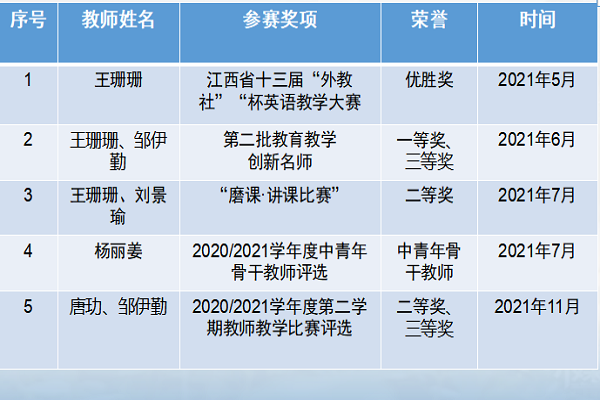 为促进青年教师的个人发展和教师团队建设,选拔优秀选手参加教学大赛,学院借助“外教社”、亿学杯等教学大赛平台,每年举行一次青年教师教学大赛,近十年来,已有多名教师和专业课教师获奖。