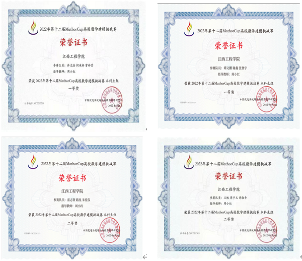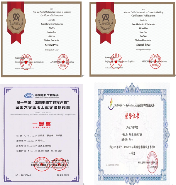 2021年我院吴怡露、陈黎莎、赵志焱、杨云荣获第十一届APMCM亚太地区大学生数学建模竞赛国际二等奖。