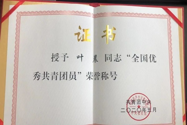 叶晨,在严峻的疫情期间,不顾自己病重的身躯,依然奋战在抗疫一线,生动地诠释了江工学子在关键时刻的使命与担当,2020年叶晨同学获团中央颁发的“全国优秀共青团员”荣誉称号。