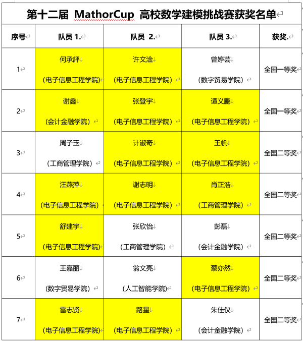 2022年,我院在第十二届MathorCup高校数学建模挑战赛中继续喜获佳绩,学生何承枰、许文淦、张登宇和谭义鹏荣获全国一等奖,计淑奇、王帆、汪燕萍、谢志明、舒建宇、蔡亦然、雷志贤和路星荣获全国二等奖。