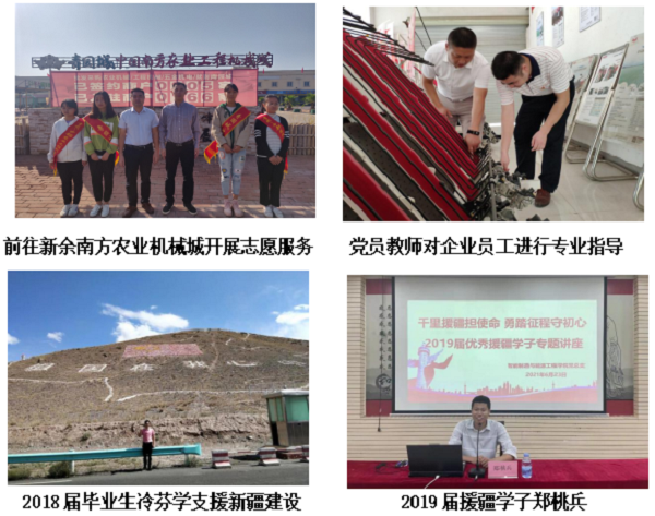 为进一步增强师生的服务意识,学院自2017年起已连续多年组织师生到新余市南方农业机械城服务一年一度的农业机械产品展,既开阔了师生的专业视野,也进一步塑造了师生德智体美劳的优良品质;2018-2019年我院共有2名大学生党员(2018届冷芬学和2019届郑桃兵同学)积极响应国家援疆号召,在毕业之际远离家乡投入到支援新疆征途中,他们不忘初心、牢记使命,既为自已增了光,也为学校添了彩。