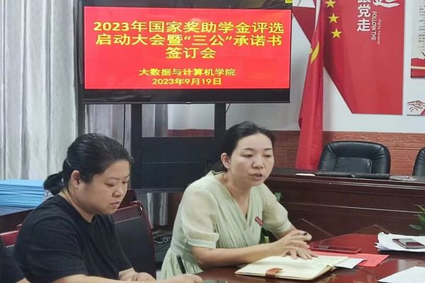 为做好学生资助工作,提高资助工作效率,大数据与计算机学院于2023年9月19日在b504举行了国家奖助学金评选启动大会暨“三公”承诺书签订会,大数据与计算机学院院长巢喜剑、党总支书记王娟以及全体辅导员班主任参加。