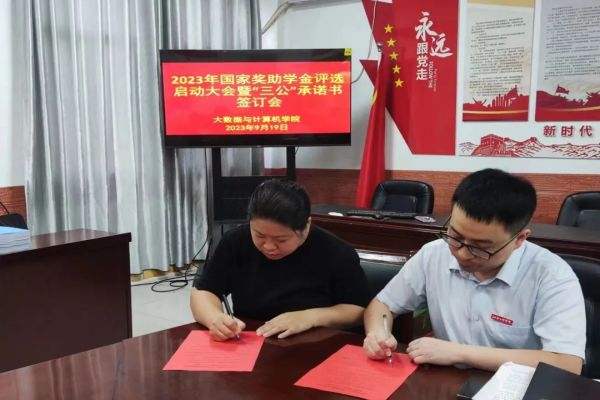 在签订会上,大数据与计算机学院的领导、辅导员班主任代表参与了承诺书的签署。他们共同签署了《大数据与计算机学院“三公”承诺书》,郑重承诺遵守国家相关法律法规和学校规章制度,严格执行奖助学金评选的相关规定,杜绝任何形式的不公平行为。