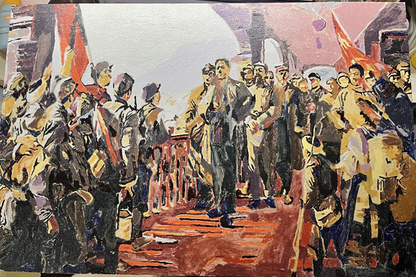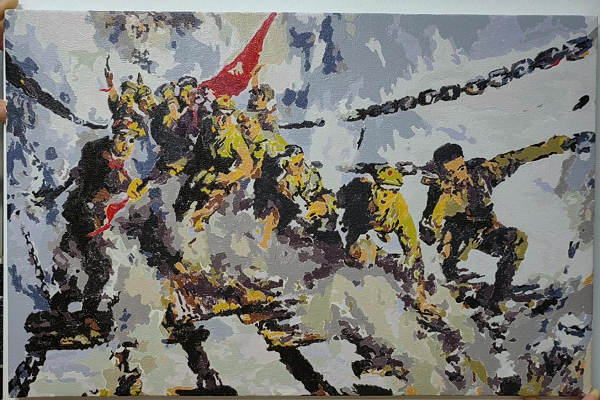 作品简介:此作品描绘红军抢占泸定桥的战斗场面,红军二十二名突击队员在全团火力掩护下冒着川军的密集火力攀踏铁索,向对岸冲击,当接近桥头时,川军突然施放火障,突击队勇敢地穿过火墙,迅速歼灭守桥之敌。桥头敌人点燃的烈火跃动着,给勇士们镀上了一层火红色。透过铁索的间隙,江水滔滔奔流,远处群山如削,构成险峻而壮观的奇景。飞夺泸定桥作为长征中的一场重要胜利,对于红军顺利通过大渡河,摆脱国民党军队围堵意义重大。