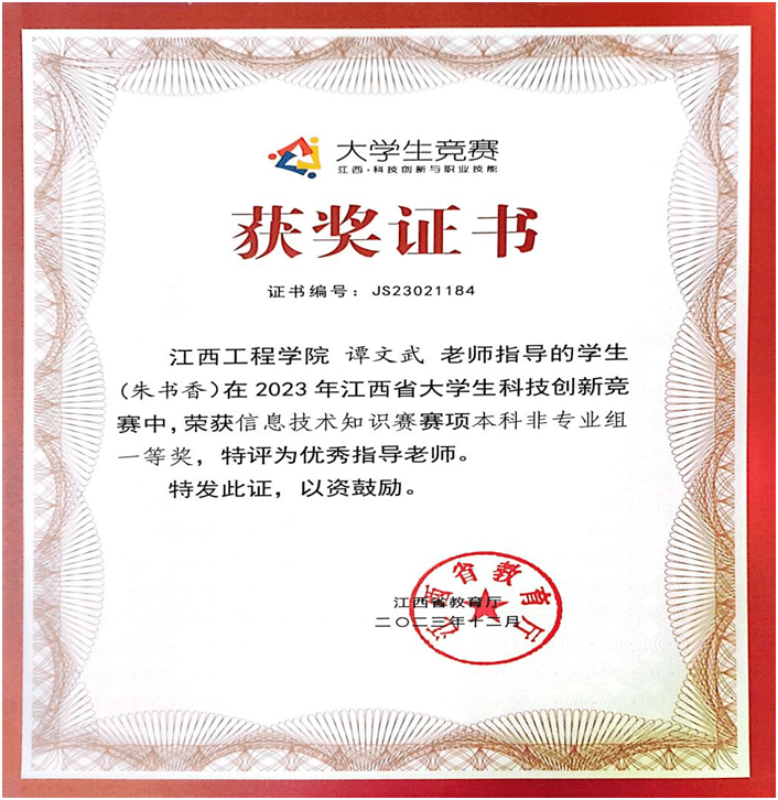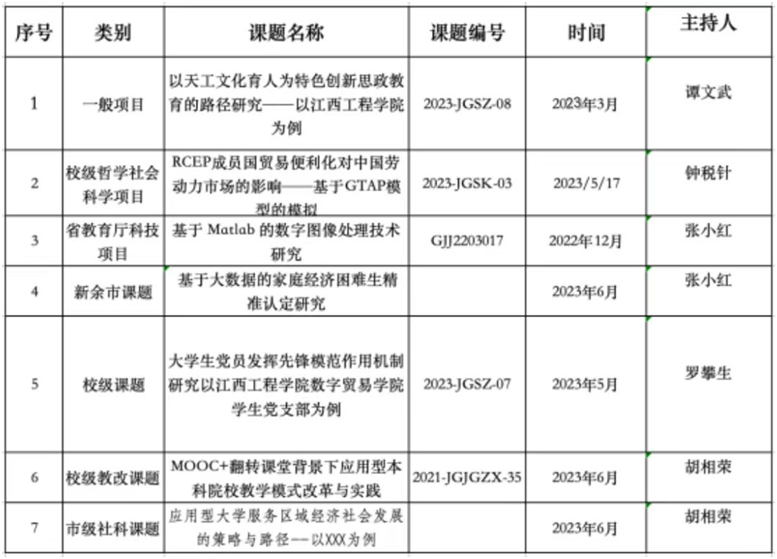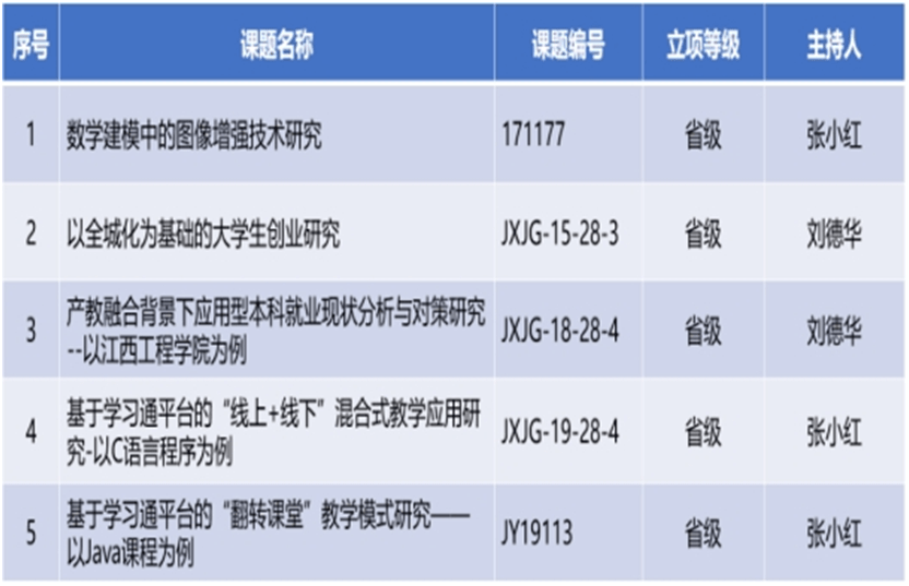 学院多年来立足实际,多措并举,在学科建设和科研竞赛方面取得了诸多成果。学院主持国家级项目一项、国家社科课题一项,主持或参与省级课题80余项,编著教材32部,发布论文200余篇,申请专利45项,指导学生参加大赛获省级以上一等奖130余项。其中,学院教师在省级教改课题立项6项,发表SCI等高质量论文3篇。2023年,学院成功入选校级重点产业学院建设单位,下一步将朝省级重点产业学院方向迈进;江西省社会科学基金“十四五”地区项目成功立项,此次项目的成功立项是学院在省社科领域的一次重大突破,将进一步促进学院在省域高水平应用型本科高校的影响力。