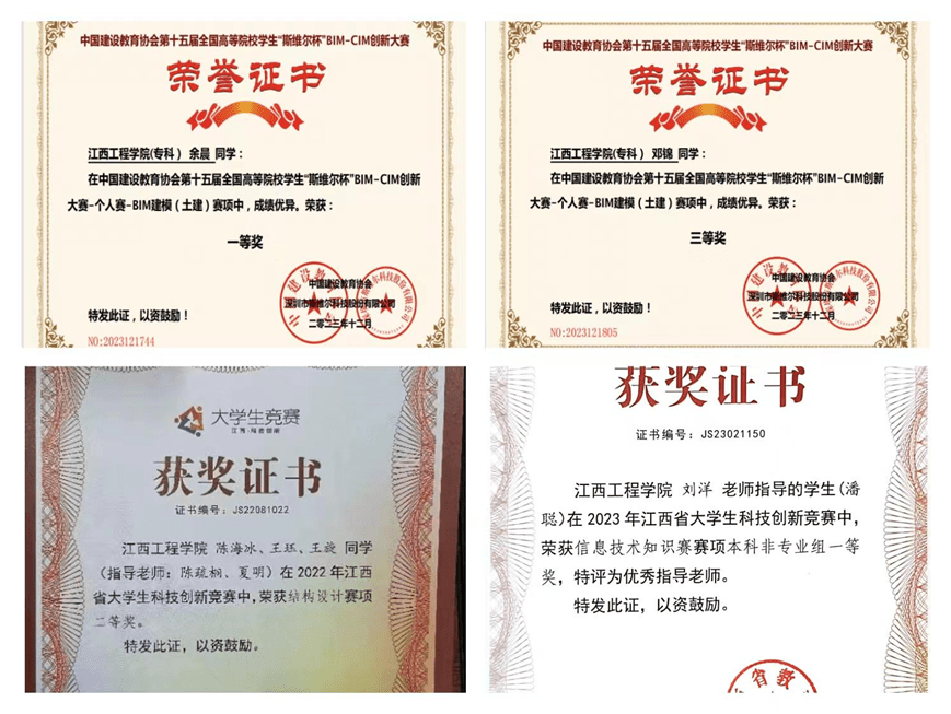 学院积极参加BIM建模竞赛、结构设计竞赛等专业性比赛和大学生信息技术等非专业性比赛,实现“岗课赛证”的目标,鼓励学生多参赛。学生在全国高等院校学生“斯维尔”BIM-CIM创新大赛中荣获国家一等奖;在第二届盈建科杯全国大学生智能建造数字化设计大赛荣获国家三等奖;在第二届盈建科杯全国大学生智能建造数字化设计大赛荣获国家三等奖;在江西省第十六届运动会跳绳比赛中荣获省运会第一名;在江西省大学生信息技术大赛荣获省级一等奖8人;在江西省大学生信息技术大赛荣获省级二等奖13人。