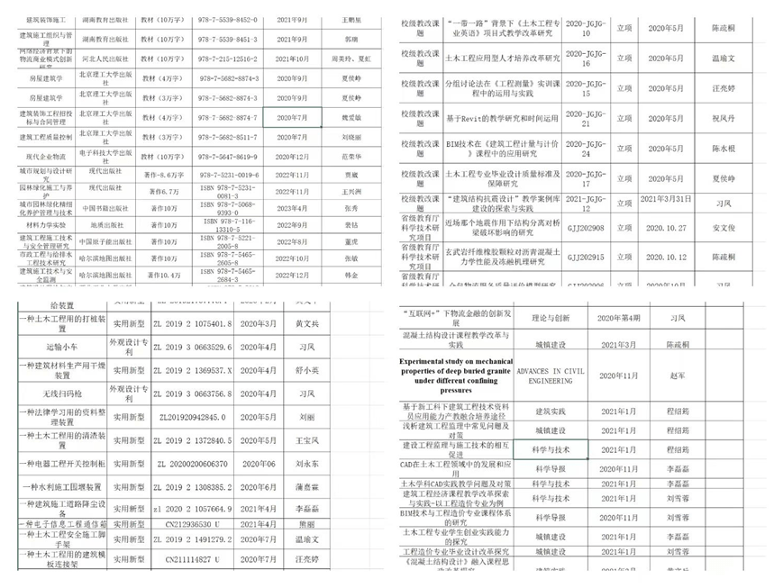 学院教师先后在《建筑实践》、《防护工程》、《基层建设》、《建筑工程》、《科学导报》、《理论与创新》、《科教论坛》、《建筑工程技术与设计》、《建筑工程质量控制》等核心以上刊物发表论文;申请专利51项;课题32项。