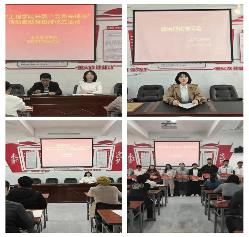 学院党总支始终把政治建设摆在首位,坚定拥护“两个确立”、坚决做到“两个维护”。加强基层党组织建设,规范党员发展流程,持续扎实开展系统培训活动。组织党员参观赣西抗战博物馆、九龙山革命斗争陈列馆,邀请校领导到红色基地现场讲党课、利用“天工大讲堂”和“学习强国”等平台加强理论武装。通过创新方法手段,深化“领导干部上课堂”、“支部书记讲党课”,不断提高党员的政治素质。严格落实“三会一课”、主题党日、每周政治理论学习制度。学院党总支开展“四下基层”活动,组织师生座谈会,建立师生意见处理台账,解决师生急难愁盼的问题,提高师生幸福感、获得感。设立了党员先锋岗和党员模范宿舍,在维护学院稳定、联系服务等中心任务中发挥先锋模范作用。