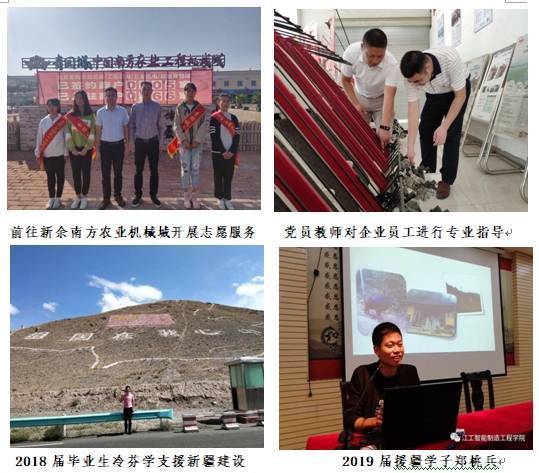 学院始终坚持服务地方经济发展,连续四年组织师生对口帮扶新余市袁河工业平台一年一度的南方农业机械产品展;同时积极鼓励在校大学生党员支援新疆建设,共为新疆建设发展输送了2名在校大学生党员,始终践行“为党育人、为国育才”的初心和使命。