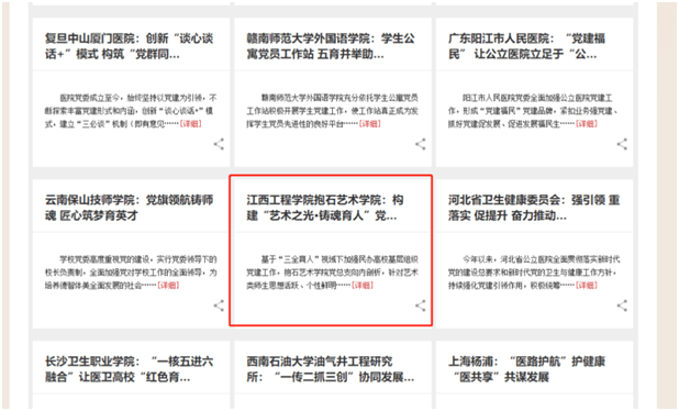 2022年8月,《构建“艺术之光·铸魂育人”党建新体系》入选第六届全国基层党建创新典型案例是江西省(非公经济组织和社会组织类党建)仅有1个;