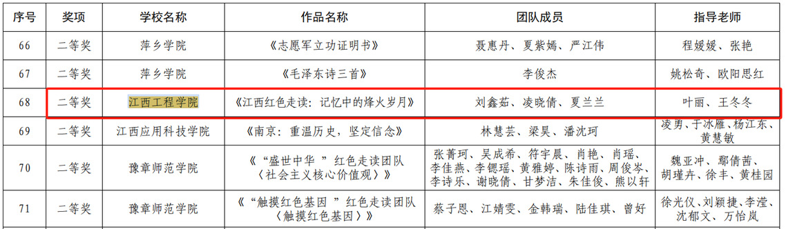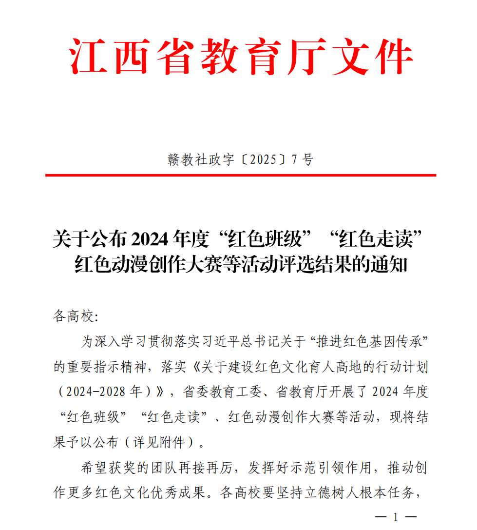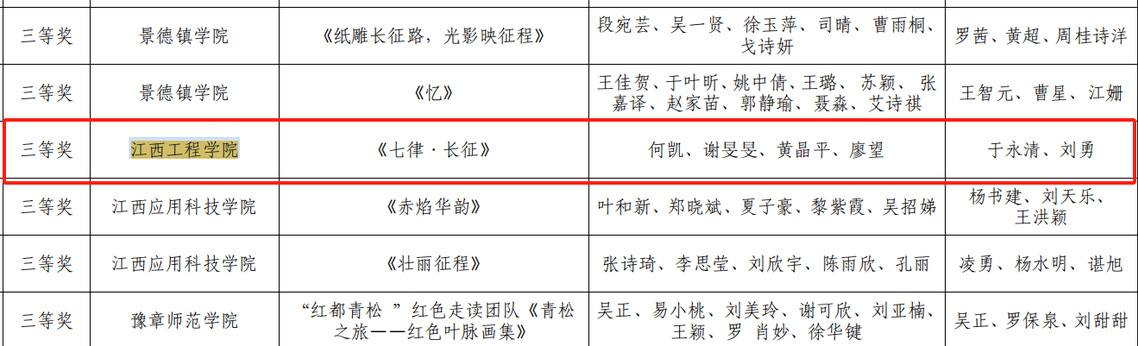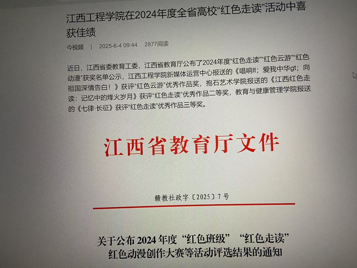 近日,江西省委教育工委、江西省教育厅公布了2024年度“红色走读”“红色云游”“红色动漫”获奖名单公示,华亿在线新媒体运营中心报送的《唱响lt;爱我中华gt;向祖国深情告白!》获评“红色云游”优秀作品奖,抱石艺术学院报送的《江西红色走读:记忆中的烽火岁月》获评“红色走读”优秀作品二等奖,教育与健康管理学院报送的《七律·长征》获评“红色走读”优秀作品三等奖。